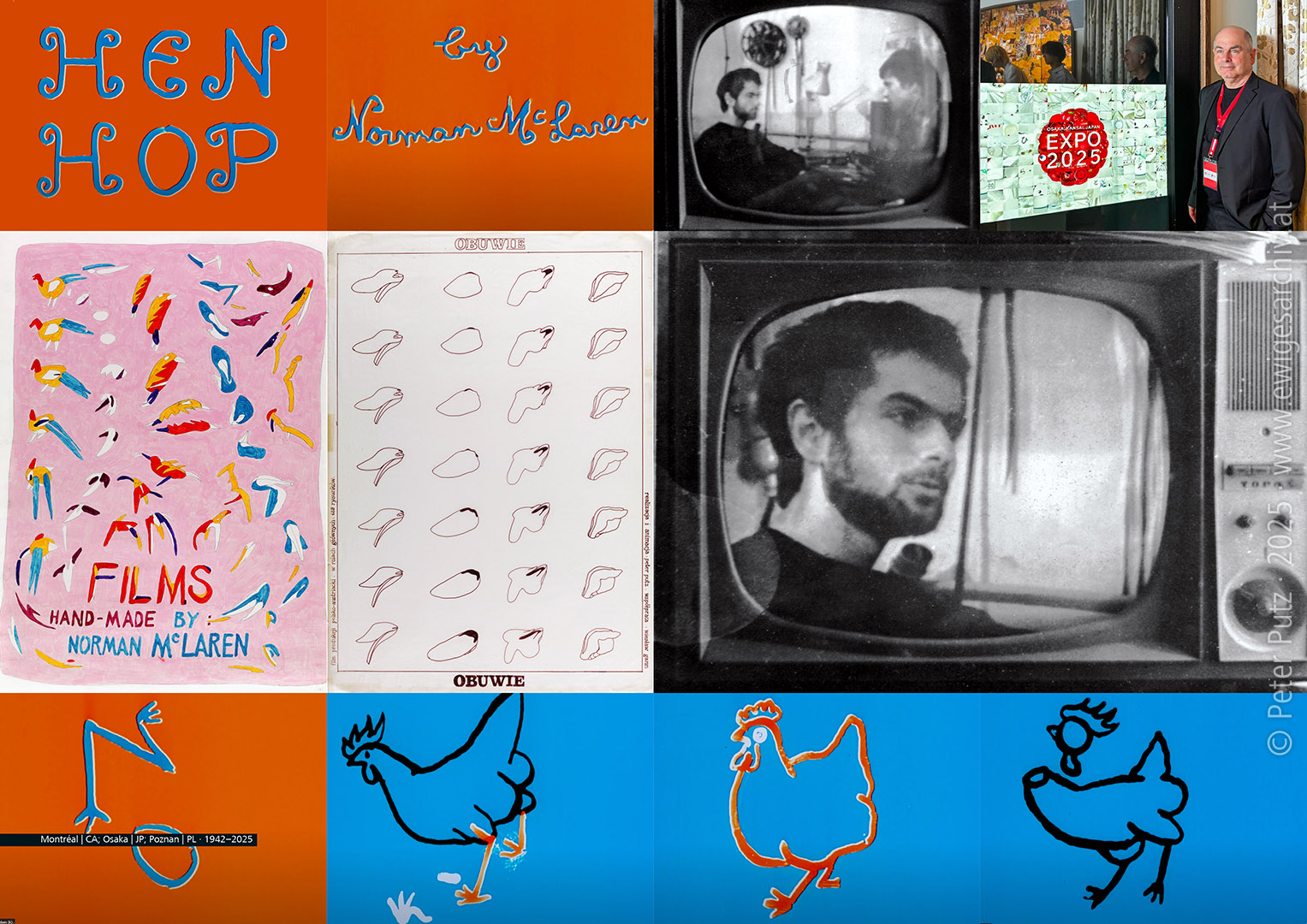 Animation: Peter Putz · 1977–20?? How it all began! Montréal | CA; Osaka | JP; Poznan | PL · 1942–2025 (Film stills Hen Hop © National Film Board of Canada∞ © PP · # 3513 · www.ewigesarchiv.at) Tonight, I have been invited by ASIFA Austria, the Austrian branch of the International Association of Animated Film Makers (Association internationale du film d’animation), to talk about my animated films as part of a ‘salon’. This is a great honour and a pleasure for me, as well as an opportunity to reflect on my work. At this point, I would like to share a small fragment in which I have summarised for myself how my passion and enthusiasm for animated film began: In 1977, I studied graphic design, in particular poster design, which had a special status in Poland, at the Academy of Fine Arts in Poznan, Poland. At a film evening organised by the local student film club, I saw a programme of films by Norman McLaren, who was originally from Scotland but lived in Canada, which he had drawn directly onto blank film strips and later coloured in a further process. I was so enthusiastic that I felt an overwhelming desire to make films myself that very evening, so I contacted the film club and produced my very first ‘animated’ film, OBUWIE (Shoes). (see link)