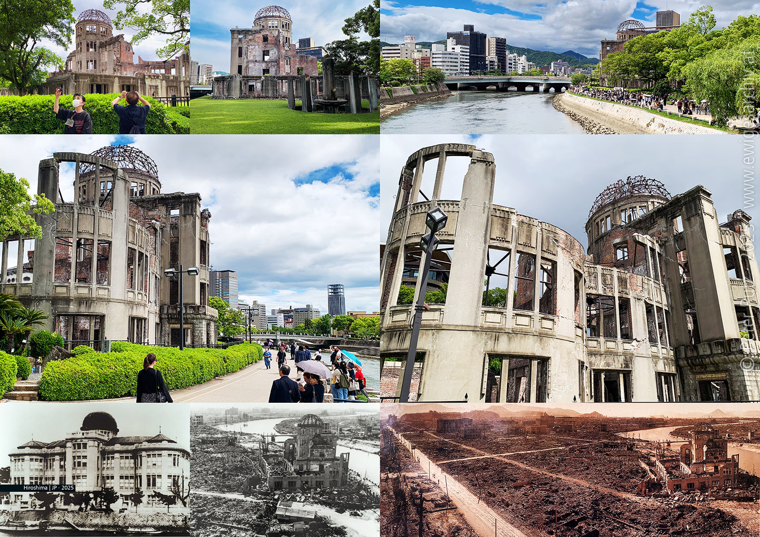 The Atomic Bomb Dome in Hiroshima. Visited on a sunny day early in the morning. Hiroshima | JP · 2025 (© PP · # 3510 · www.ewigesarchiv.at) I had initially planned to visit the city of Hiroshima, but then I became unsure about my travel plans – after all, a Japanese friend from Nagasaki (the city where the second atomic bomb was dropped in history), whom I had met in Montreal in 1988, had encouraged me to do so, even urging me to visit. Hiroshima can be reached from Osaka, the site of EXPO 2025, in about an hour and a half by the fast Shinkansen train. Hiroshima and the ‘Atomic Bomb Dome’ are located on the banks of the Ōta River (Ōtagawa). On this sunny day, memorial concerts by brass bands from various schools in Japan took place on the riverbank opposite the ‘Dome’, creating a special acoustic atmosphere. On the other side of the river is Hiroshima Peace Memorial Park with the cenotaph for the victims, a memorial to the deceased children and the Hiroshima Peace Memorial Museum. All of it is incredibly moving and thought-provoking. It was a visit that will stay with me for the rest of my life. The photos in the bottom row are reproductions of the information boards.