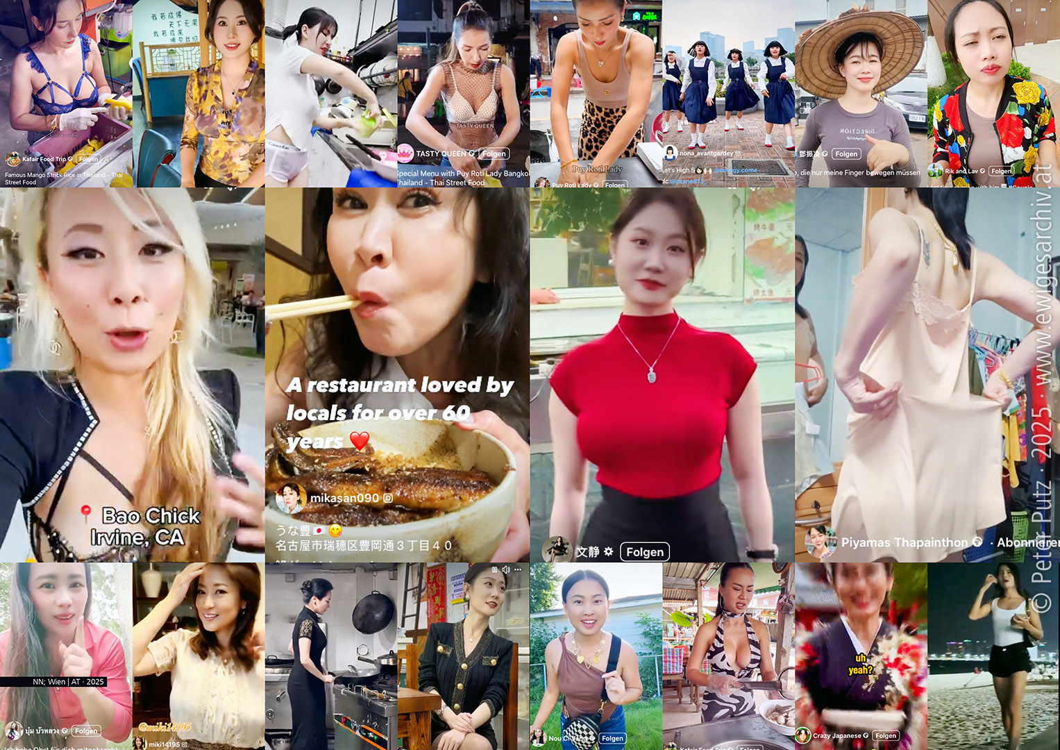 BRAINROT. Zuschauen und aktiv daran mitwirken, wie bzw. dass mein Gehirn verrottet. NN; Wien | AT · 2025 (© NN; Tableau © PP · # 3525 · www.ewigesarchiv.at) Ich habs wirklich gut: Abgesehen davon, dass ich (derzeit noch) nicht davon bedroht bin, dass mich eine Drohne zerfetzt und dass trinkbares Wasser aus dem Wasserhahn fließt, darf ich mir zur Zerstreuung, Ablenkung und Anregung „gratis“ ganz kurze und sehr erstaunliche Videos anschauen. Das Anschauen der meist nur wenige Sekunden langen, hochformatigen „Reels“ – auf Facebook – sicher und insbesondere auch auf TikTok, aber das kenne ich nicht, weil ich mich davor fürchte – heißt „BRAINROT“ (Gehirnverrottung, Hirnverfall). Das hat mir eine mir sehr nahestehende Person erklärt, die weiß, dass ich, eine Stütze und aktiver Förderer der SM-Plattform „Facebook“ des Meta-Konzerns, durchaus mich gerne dem Betrachten dieser Videos hingebe: Etwas vereinfacht geschrieben, nehme ich zwei Hauptströme der mir zugeführten Fast Watch Spezereien wahr: Zum Einen, alles was mit Kameras, Dreharbeiten, Behind-the-Scenes Videos und Ähnlichem zu tun hat, zum Anderen Videos, die Frauen zeigen, die (vermutlich in Thailand) in relativ knapper Bekleidung Streetfood zubereiten (Hallo „Puy Roti Lady“!), ein Nachthemd probieren oder mir Restaurants in Japan empfehlen, die Einheimische lieben.