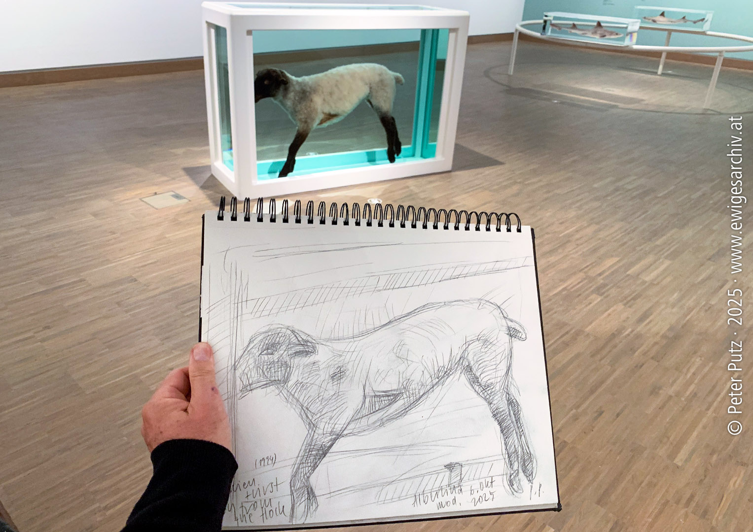 Damien Hirst, Away from the Flock, 1994 @Albertina modern. Skizze: Peter Putz, 2025,