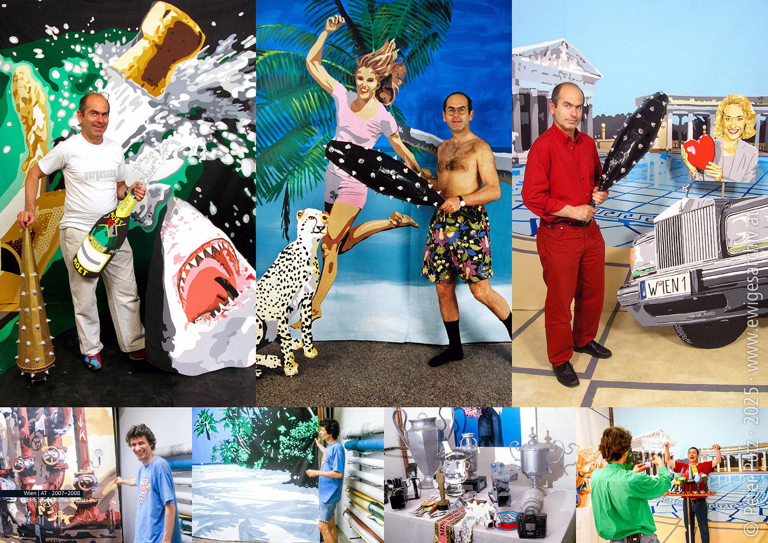 Götz Bury’s ‘Narziss Photo Studio’ – formerly known as ‘Traumfabrik’. Vienna | AT · 2002–2008 (Photos top row © Götz Bury; © PP · # 3518 · www.ewigesarchiv.at) I’m a little excited, bordering on joyfully hyper: Today, editing is set to begin on my film about the experimental sculptor and performer Götz Bury! Have I reviewed and transcribed the footage sufficiently? Have I really looked through all the video clips, some of which were recorded prophylactically many years ago, and the almost 2,000 photos, digitally leafed through them, and made the right selection? One section of the planned film will certainly be the ‘Narcissus Photo Studio,’ where I was a frequent guest. Founded by Götz Bury in 2002 as a ‘dream factory’ with numerous wonderful opportunities to stage oneself and one’s life in luxury and style. I remember well the left-hand picture, in which I hold a bottle of (most expensive) sparkling water in front of the camera and standing fearlessly next to a snapping shark, but I remember well that Götz had photographed me with my Rolls Royce and a woman who looks like a well-known television presenter (who has been presenting FPÖ-TV productions since 2021) – I had completely forgotten that. In the middle, wearing shorts but no T-shirt (it’s hot, very hot in the South Seas), on my right hand a sporty partner, very energetically charged, in my left hand a massive club. I know how to get by, I don’t put up with anything: might makes right! Our cheetah ‘Tommie’ waits patiently, behind us a palm tree and the endless turquoise sea. A dream, a life! I am always very satisfied – only the watch I wear on my wrist was stolen during a burglary shortly after the photo shoot.