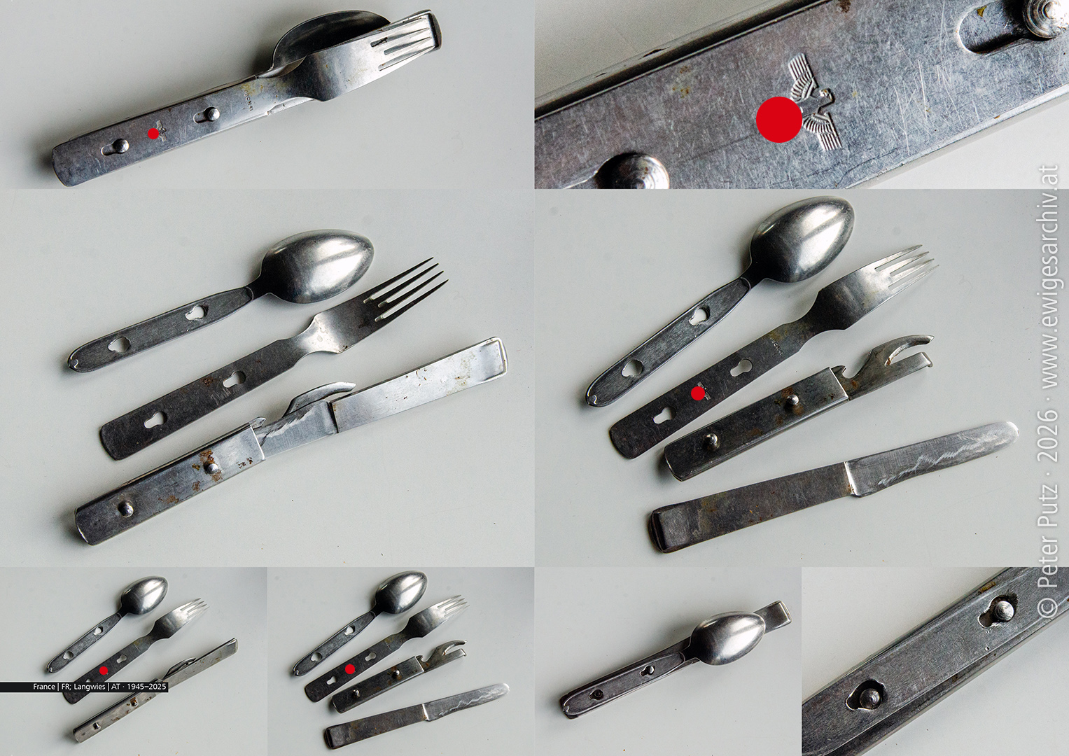 Das „Wehrmachts-Besteck“ in unserer Küchen-Schublade. France | FR; Langwies | AT · 1945–2025 (© PP · # 3667 · www.ewigesarchiv.at) Während der Weihnachts-Feiertage tauchte es plötzlich auf: Ein zusammengestecktes Metall-Besteck, bestehend aus Löffel, Gabel, einem Dosenöffner und Kapselheber, in dessen Metall-Futteral ein Messer. Auf der Unterseite der Gabel eingeprägt der „Reichsadler“ mit Hakenkreuz – das Symbol, DAS SYMBOL des „Deutschen Reiches“, des NS-Terror-Regimes. Das Besteck war offensichtlich ganz hinten in einer der Laden in der Küche gesteckt, ich hatte es nie vorher gesehen – ich, der Älteste in der Familie mittlerweile. Der 26-jährige, halb ironisch lachend, halb fragend: „Wo kommt denn DAS her?“ – noch irgendein Satz, an den ich mich nicht erinnere, später dann: „Waren das (meine/unsere Familie mütterlicherseits) jetzt NAZIS?“. Spontan habe ich mich natürlich geärgert – nach alldem, was ich über die NS-Zeit in Ebensee recherchiert hatte, nach den Videos, die ich dazu produziert hatte. Für mich war klar, dass meine Großeltern und meine Mutter absolut keine Nazis waren, wie meine Mutter im Video „Erna und Gerti erzählen“ (s. link) erzählte, war mein Großvater Johann Promberger „ein Schwarzer“, also ein „Christlich-Sozialer“, der bei der Radio-Ansprache vom damaligen Bundeskanzler Kurt Schuschnigg am Vorabend des Einmarsches deutscher Truppen im März 1938, die mit den Worten „Gott schütze Österreich“ schloss, in Tränen ausgebrochen war. Für mich war das also klar, aber spontan hatte ich auch keine Erklärung, woher dieses Besteck stammte. Außerdem: war das Vorhandensein eines Besteckes mit eingeprägtem Hakenkreuz ein Beleg dafür, dass jemand ein „Nazi“ war?