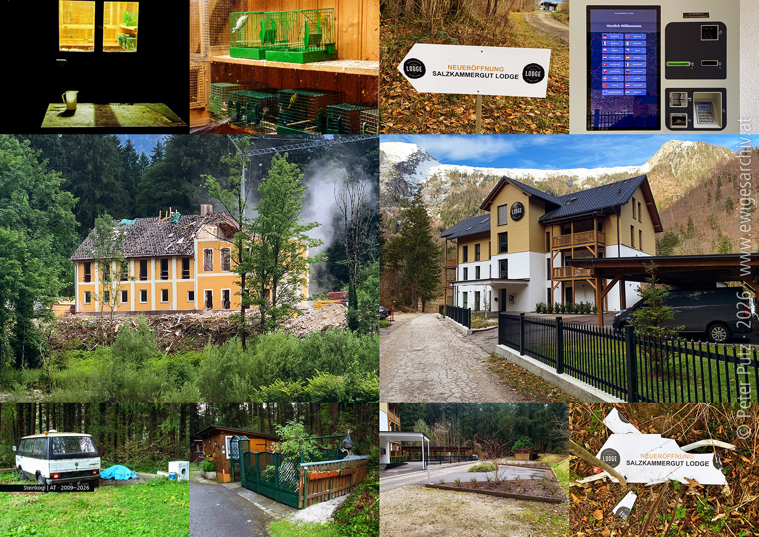 The „Lard Factory“ becomes the „Salzkammergut Lodge“ with self-check-in in 18 languages! An attempt to remember a (marginalized) enclave on the Traun River. Steinkogl | AT · 2009–2026 (© PP · # 3748 · www.ewigesarchiv.at) Although I claim to run a perpetual archive, in reality, I only found the archive box I had labeled „Ebensee“ or „Nazi-Era Ebensee“ after a long search. Inside was the brochure „Industrial History of Ebensee“ with a double-page spread about the „Lard Factory“ (see below) in Steinkogl near Ebensee – located in the middle of the forest, close to the right bank of the Traun River. The children from the „Lard Factory“ were my classmates in the two-room elementary school in Langwies. On the ground floor were grades one through three, taught by Ms. Baumgartner (?), and on the upper floor were grades four through eight, taught by Mr. Feuchtner, the headmaster. I don’t recall having much contact with the „children from the lard factory,“ who had a considerably longer walk to school than I did—no school bus, and I don’t think they took the train from Steinkogl to Lahnstein. What the lard factory was, what it looked like, who lived there—all of that was unclear to me. What was clear, however, was that it was a place quite different from my own circumstances. The photos in the upper and lower rows on the left were taken in October 2009, around 6:30 a.m., during a morning hike. A window of an adjacent wooden hut was lit, revealing a row of birdcages belonging to the „bird catchers.“ Next to the building were small garden sheds with fenced seating areas, and various other objects were scattered around the grounds. In 2021, the roof was torn down and renovations began. In 2023, signs appeared advertising a „Salzkammergut Lodge,“ and recently, during one of my walks, I saw the self-check-in system in 18 languages. What became of my classmates from the „lard factory“? What did their lives turn out like?