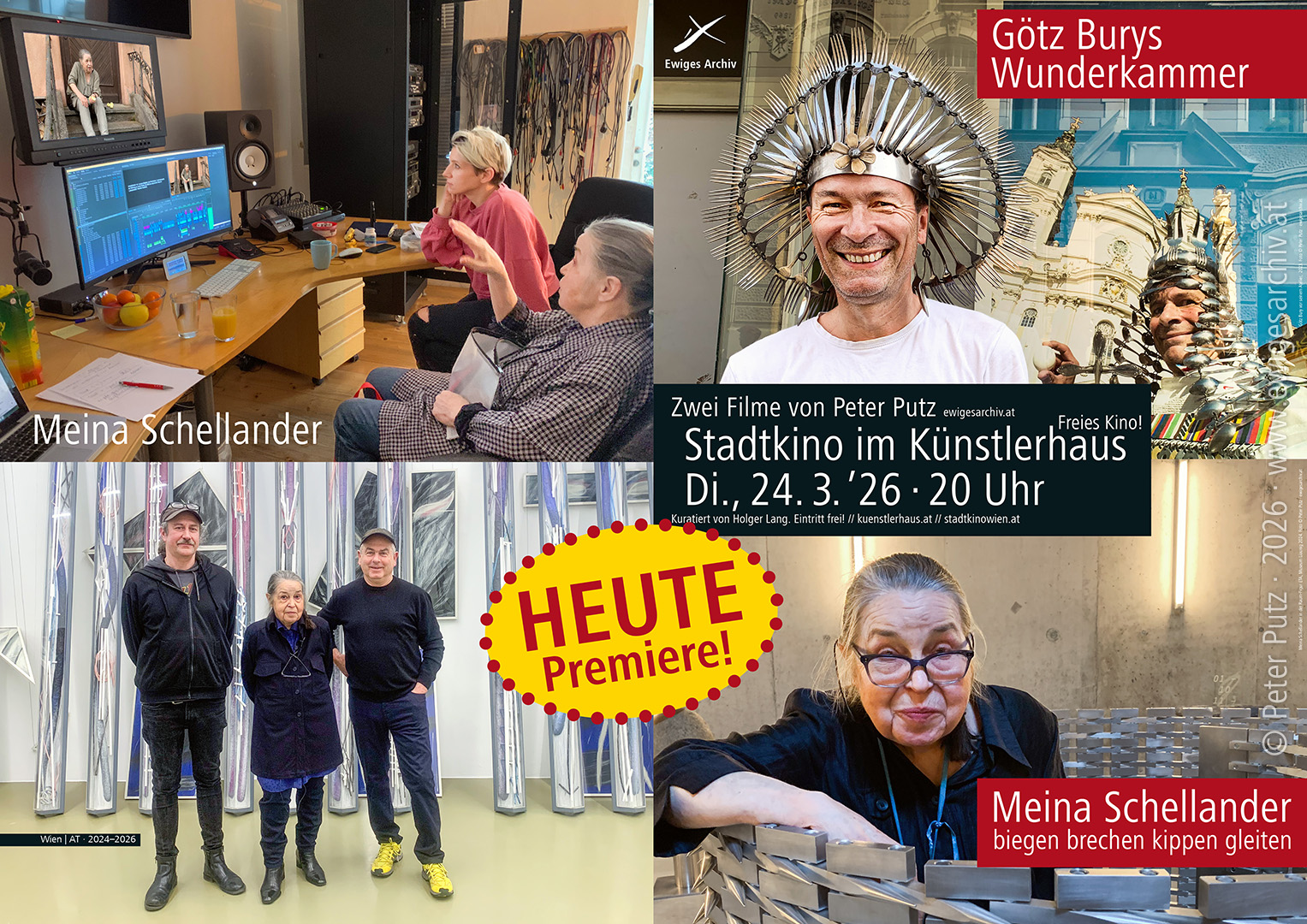 Einen Film machen über die große österreichische Künstlerin Meina Schellander, der in einem Double-Feature gemeinsam mit dem Film „Götz Burys Wunderkammer“ HEUTE, am Di., 24. März 2026, 20 Uhr im Stadtkino im Künstlerhaus Wien Kinopremiere hat! Eintritt frei! Wien | AT · 2024–2026 (© PP · # 3738 · www.ewigesarchiv.at) Die Arbeit an diesem Film hat im Grunde vor mehr als 50 Jahren begonnen, als ich 1974 in der Galerie nächst St. Stephan in Wien die kleine Plastik „Raumschaufel Linz“ von Meina Schellander gesehen habe – die hat mich interessiert und beschäftigt. Viele Jahre später lernte ich die Künstlerin persönlich kennen, deren konsequentes, „sperriges“, sehr präzises Werk mich fasziniert. Im Jahr 2024 entschloss ich mich, den lange angedachten und immer wieder verschobenen Film über sie zu beginnen – ich filmte bei ihrer großen Ausstellung im Museum Liaunig in Neuhaus | Suha in Kärnten und begleitete sie zu Platzgestaltungen in Österreich, die sie teils mehr als 30 Jahre nicht mehr gesehen hatte. Ich freue mich sehr, gemeinsam mit Meina Schellander und vielen der Mitarbeiter*innen, diesen Film erstmals auf der großen Leinwand in einem der schönsten Kinos von Wien zu sehen! Danke von Herzen allen, die daran mitgearbeitet haben!