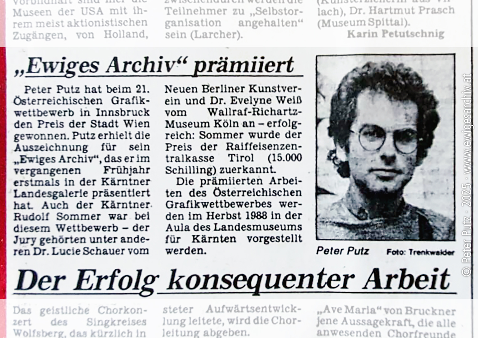 „Eternal Archives“ Awarded! Bravo! It’s been a while, too! Innsbruck | AT · 1988 (© PP · # 3612 · www.ewigesarchiv.at) A little surprise: I was searching through the fibrils and membranes of the Eternal Archive’s image database for a black and white photo of me holding one of the folding pictures I’d put together in the 1980s up to the camera. Suddenly—not to mention „out of the blue“—a photo of a newspaper clipping popped up: „That’s me in the newspaper!? Eternal Archive Awarded??? When was that? The City of Vienna Prize at the 21st Austrian Graphic Design Competition in Innsbruck!! Look at that!“ I had completely forgotten. The story was published on the culture page of the Kleine Zeitung on March 18, 1988. Well—time flies.