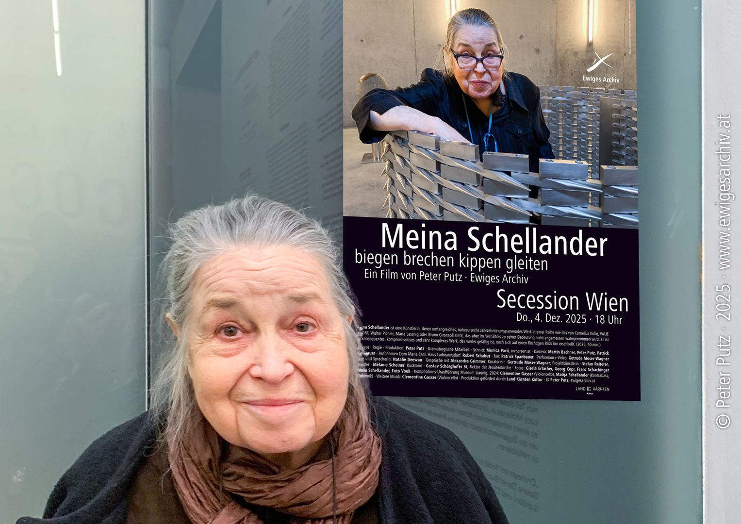 Premiere: „Meina Schellander · biegen brechen kippen gleiten“. Wien | AT · 2025 (© PP · # 3641 · www.ewigesarchiv.at) Mein Film über die große österreichische Künstlerin wird am 4. Dezember 2025 in der Secession Wien erstmals öffentlich gezeigt werden. Es ist der Abschluss einer Arbeit von mehr als eineinhalb Jahren – die allerdings gedanklich schon viele Jahre, wohl Jahrzehnte vorher begonnen hat. Zum ersten Mal habe ich Anfang der 1970-er Jahre ihre Arbeit „Raumschaufel Linz“ in der Galerie nächst St. Stephan gesehen, persönlich kennenlernte ich sie Anfang der 1980-er Jahre in Kärnten, ihr umfangreiches Werk – Skulpturen, Installationen, Gestaltungen im öffentlichen Raum, Malerei, Grafik – hat mich viele Jahre hindurch beschäftigt und beeindruckt: Es ist ein konsequentes, kompromissloses und sehr komplexes Werk, das weder gefällig ist, noch sich auf einen flüchtigen Blick hin erschließt.
