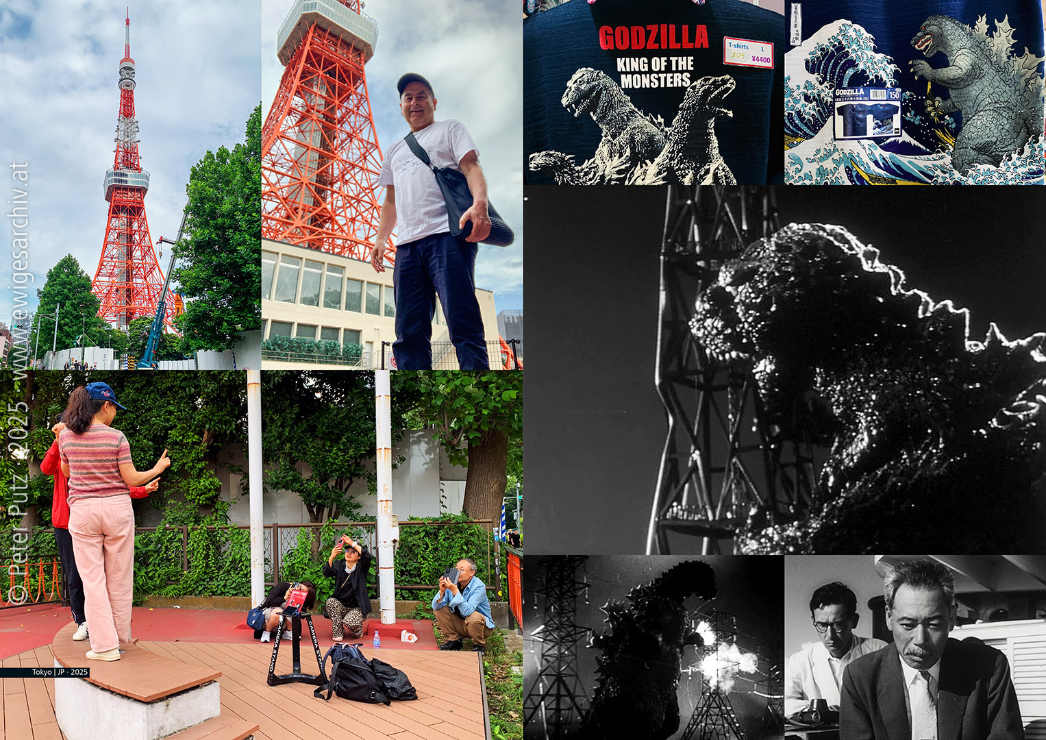 GODZILLA, King of the Monsters, the atomic bombings of Hiroshima and Nagasaki, and (my) selfie in front of Tokyo Tower. Tokyo | JP · 1954–2025 (Godzilla © Tōhō Studios; © PP · # 3538 · www.ewigesarchiv.at) Should I create a tableau today about the Foodora and Wolt food delivery riders who recklessly race around on e-scooters, especially on cycle paths, with the tauntingly attached sign ‘I am a bicycle’ on the back? Or about the transformation of Vienna in recent years, which has been noticeable in many ways (in my humble opinion, not for the better)? About the global eavesdropping and espionage network ‘Echelon’ operated by the intelligence services of the USA, Great Britain, Australia, New Zealand and Canada? Or something lighter to cheer me up? However, in the image database of the Eternal Archive, there were only seven (7!) entries under the term ‘joy’, not a single one under ‘cheerful’ and “fun”, and the term ‘funny’ yielded only nine entries on Franz Lustig, one of Wim Wenders‘ cameramen. That gives me pause for thought. How about Godzilla? How about a tableau to go with it?