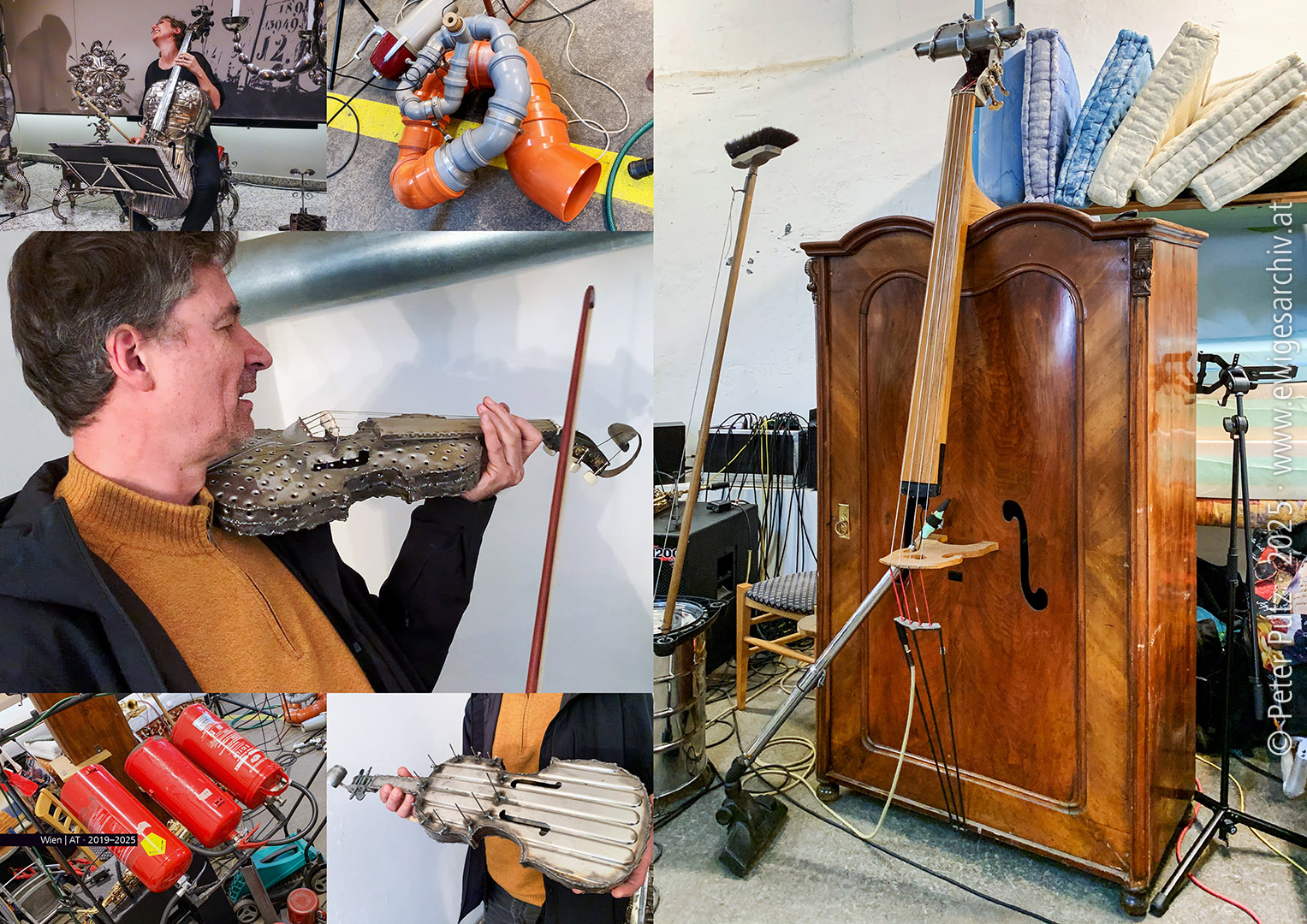 Götz Bury builds musical instruments: a violin from a washing machine drum, a double bass from a box, a tuba from sewer pipes, and a drum kit from fire extinguishers. Just to give a few examples. Vienna | AT · 2019–2025 (Works © Götz Bury; © PP · # 3530 · www.ewigesarchiv.at) Because the film about the artist Meina Schellander, whom I greatly admire, still needs some time to be completed (her work is very complex and she rightly takes great care to ensure that the portrayal corresponds to her ideas), I thought that in the meantime I could make a film about the experimental sculptor and performer Götz Bury. Just cobble together the film clips and photos taken over many years, now decades, re-record an interview, and you’re done! Very simple, quick, could be quite funny and good. That’s what I thought. But his work is also very thoughtful, very diverse, very comprehensive – in a different way, and the work on the film ‘Götz Bury Wunderkammer’ will probably take even longer. This morning, while preparing for another day of editing, I came across some sequences that had been overlooked, some scenes about the musical instruments he built. How do we incorporate them now? But they definitely have to be in the film.