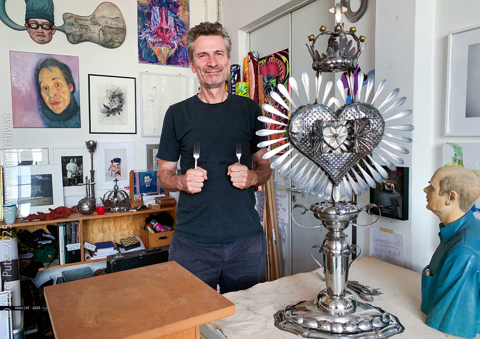 Götz Bury’s ‘Shrine for a Heart of Stone’ now shines in my studio, much to my delight! Vienna | AT · 2025 (Heart Shrine © Götz Bury; © PP · # 3561 · www.ewigesarchiv.at) Inside the heart, made of embossed stainless steel sheet from a washing machine drum, is a heart-shaped stone from the Bregenzer Ache (on the side of the work not visible here). the heart can be opened on both sides like a small tabernacle, a small crown balances on top of the halo made of cut spoons – all supported by an ensemble of shakers, ice cream bowls, spoon parts and serving plates. A stainless steel sculpture, 100 cm high, designed by Götz Bury, filed and welded in 2022, hand-polished by him with cut, slightly dampened Wettex cloths before handing it over to me. I can’t put it any other way: when I saw this ‘shrine for a heart of stone’ in Götz Bury’s chamber of wonders, in his workshop, my heart leapt! I am incredibly happy. It is a work that has so much tension in its form and materiality, triggers so many associations, that even when I glance at it casually, it raises questions, provides inspiration – and perhaps even gives hope and comfort when it matters. Simply a work that already shines more brightly and fulfils me more than the sight of the latest Tesla. (Well, that’s easy, because I wouldn’t even want one of those things as a gift.)