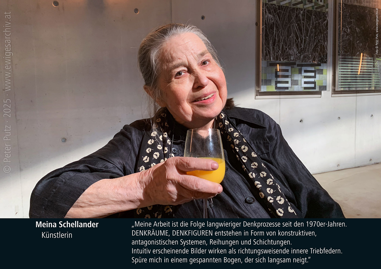 Herzliche Gratulation zum Geburtstag, Meina Schellander! (© PP · # 3541 · www.ewigesarchiv.at) Meina Schellander ist eine Künstlerin, deren umfangreiches, nahezu sechs Jahrzehnte umspannendes Werk in einer Reihe wie das von Cornelius Kolig, Valie Export, Walter Pichler, Maria Lassnig oder Bruno Gironcoli steht, das aber im Verhältnis zu seiner Bedeutung nicht angemessen wahrgenommen wird. Es ist ein konsequentes, kompromissloses und sehr komplexes Werk, das weder gefällig ist, noch sich auf einen flüchtigen Blick hin erschließt.