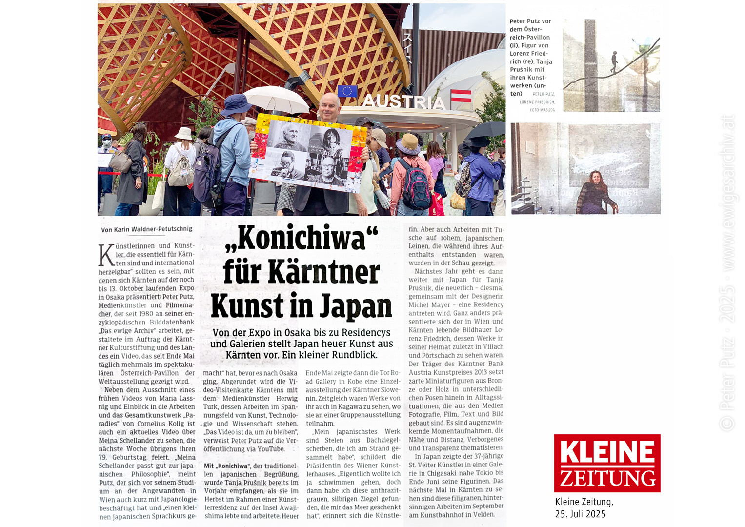 Von Karin Waldner-Petutschnig. Künstlerinnen und Künstler, die essentiell für Kärnten sind und international herzeigbar" sollten es sein, mit denen sich Kärnten auf der noch bis 13. Oktober laufenden Expo in Osaka präsentiert: Peter Putz, Medienkünstler und Filmemacher, der seit 1980 an seiner enzyklopädischen Bilddatenbank „Das Ewige Archiv" arbeitet, gestaltete im Auftrag der Kärntner Kulturstiftung und des Landes ein Video, das seit Ende Mai täglich mehrmals im spektakulären Österreich-Pavillon der Weltausstellung gezeigt wird.