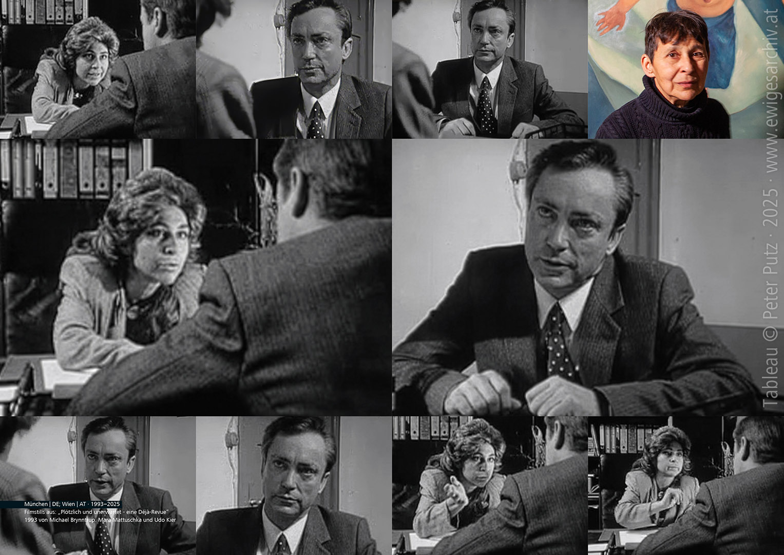 Mara Mattuschka mit Udo Kier im Film „Plötzlich und unerwartet – eine Déjà Revue“ von Michael Brynntrup. München | DE; Wien | AT · 1993–2025 (Filmstills © Michael Brynntrup; Tableau © PP · # 3639 · www.ewigesarchiv.at) Die großartige Malerin und Filmemacherin und Schriftstellerin und wasweißichnoch-Künstlerin Mara Mattuschka erzählte mir gestern beiläufig, während HiRes-Repros ihrer Arbeiten für meinen in Produktion befindlichen Film über sie vom Profi-Fotografen Dieter Brasch angefertigt wurden, erzählte also so nebenbei, sie hätte ja in einem Film gemeinsam mit dem vorgestern 81-jährig verstorbenen Udo Kier mitgespielt! Die Besitzerin eines Bestattungsunternehmens mit grandioser Perücke und im eleganten Kostüm! Nachdem sie selber den link zu einem 30-sekündigen Ausschnitt auf youtube gepostet hatte, bin ich nunmehr de facto förmlich gezwungen, ein Tableau aus einigen Filmstills und einer total frischen, aktuellen Aufnahme von Mara Mattuschka (re. oben) nachzuliefern! Es sei also!