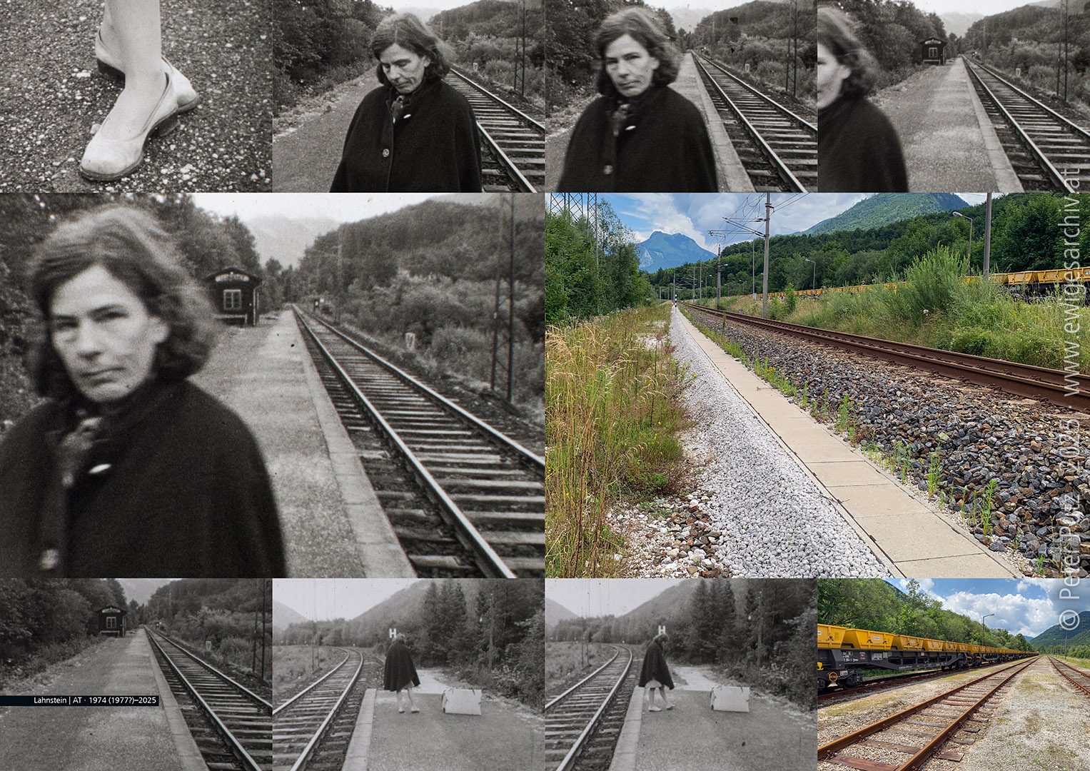 Meine Mutti bringt mich bzw. brachte mich zum Zug. Lahnstein | AT · 1974 /1977?)–2025 (© PP · # 3531 · www.ewigesarchiv.at) Oder soll ich besser schreiben: „Meine Mutter begleitet mich bzw. begleitete mich zum Zug“? Gut, das sind jetzt linguistische Spitzfindigkeiten, die in einem beiläufig geschriebenen Kurztext für ein Tableau, das ich in Kürze auf der Online-Plattform Facebook und in weiterer Folge auf meiner website veröffentlichen werde, nicht unbedingt diskutiert werden müssen. Fest steht, dass die Sequenz des digitalisierten schwarzweißen Normal-8-mm-Filmes 12 Sekunden lang ist, sie besteht aus drei Einstellungen: 01: Nahaufnahme Wetterfleck, Schwenk auf die Schuhe 02: Totale, Blickrichtung Ebensee, meine Mutter rechts im Bild geht mit gesenktem Blick zur linken Bildseite, kurz bevor sie aus dem Bild tritt, schaut sie kurz zu mir, in die  Kamera 03: Totale, Blickrichtung Bad Ischl, meine Mutter am Ende des Bahnsteiges, kickt mit dem rechten Fuß Steinchen weg, fast eine tänzelnde Bewegung. rechts von ihr mein Gepäck, ein heller Koffer und eine Kartonmappe mit Zeichnungen von mir drinnen. Ort der Aufnahme ist klar: die Haltestelle Lahnstein im Salzkammergut, es ist auch ganz eindeutig, dass ich nach Wien gefahren bin damals – nur das Jahr ist mir nicht ganz klar: Es gibt zwei Situationen, die möglich sind: Einmal: Abfahrt nach Wien zur Aufnahmsprüfung an der Angewandten, das wäre dann Herbst 1974 (damals waren die Aufnahmsprüfungen kurz vor Semesterbeginn) oder Ende des Sommers 1977, als ich zu einem Studienjahr nach Polen aufgebrochen bin – beides markante Ereignisse für mich und  wohl auch für meine Mutter, die auf den Aufnahmen eher sorgenvoll aussschaut. Ich tendiere eher dazu, dass es 1977 war, allerdings: warum habe ich dann die Eumig Normal 8 Kamera, mit der ich diese Filmszenen aufgenommen hatte, nicht nach Polen mitgenommen? Denn aus Polen habe ich leider keine Filmaufnnahmen.