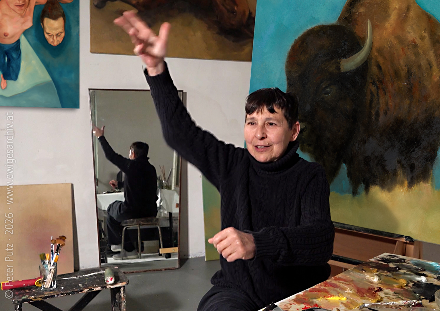 New film: “Mara Mattuschka – The picture tells me what happens next!” Vienna | AT · 2026 (© PP · # 3721 · www.ewigesarchiv.at) I am truly delighted that my new film about the painter, filmmaker, performance artist, playwright, and singer Mara Mattuschka is now complete. I am very grateful to everyone who contributed to it – first and foremost to Mara Mattuschka for granting permission to make a film about her, and to Moni Parii / On Screen for her dramaturgical assistance and editing. Like all my films, it was an independent production; I am simply interested in making documentaries about artists whom I have usually known for a long time and whose work I admire, whose work resonates with me, poses questions, sometimes irritates, disturbs, or inspires me, and teaches me something about my life or the lives of others. I met Mara Mattuschka in the mid-1980s and find the many facets of her work fascinating. This film focuses on her painting. I asked her to paint a portrait of me and documented the creation of this portrait.