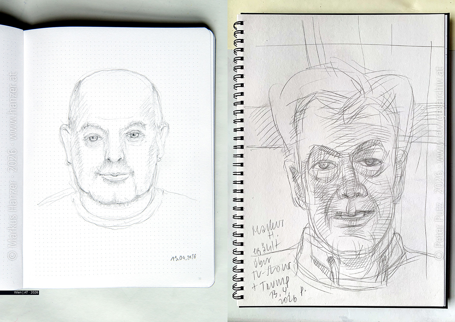 Drawing each other. Markus draws me, I draw Markus. Why, actually? Vienna | AT · 2026 (Drawing left: © Markus Hanzer, right: © PP · # 3751 · www.ewigesarchiv.at) For many years, we have been drawing each other’s portraits whenever Markus Hanzer visits me. We met during the entrance exam for the University of Applied Arts in 1974 – and we’ve been friends ever since. A long time, 52 years. What’s the point of drawing each other? A photo taken with a mobile phone creates a mimetic image of a person within fractions of a second, is instantly saved, accessible, and can be emailed and printed immediately after being taken. A drawing, a drawing with the fewest means: pencil on paper (only drawing with your finger in the sand requires even less effort), demands a slightly longer period of time, more attention, more mindfulness. Drawing each other is something more, something different, than simply pressing the red virtual shutter button on your phone with your fingertip; it’s about dedicating time to the other person, focusing on them, and attempting to find somewhat characteristic lines. Drawing is the translation of a visible impression into another form, an attempt to transfer spatial perception onto a flat piece of paper—however clumsy or simple the result may be. It’s a modest adventure that harms no one and costs nothing—except a little time and a quick decision.