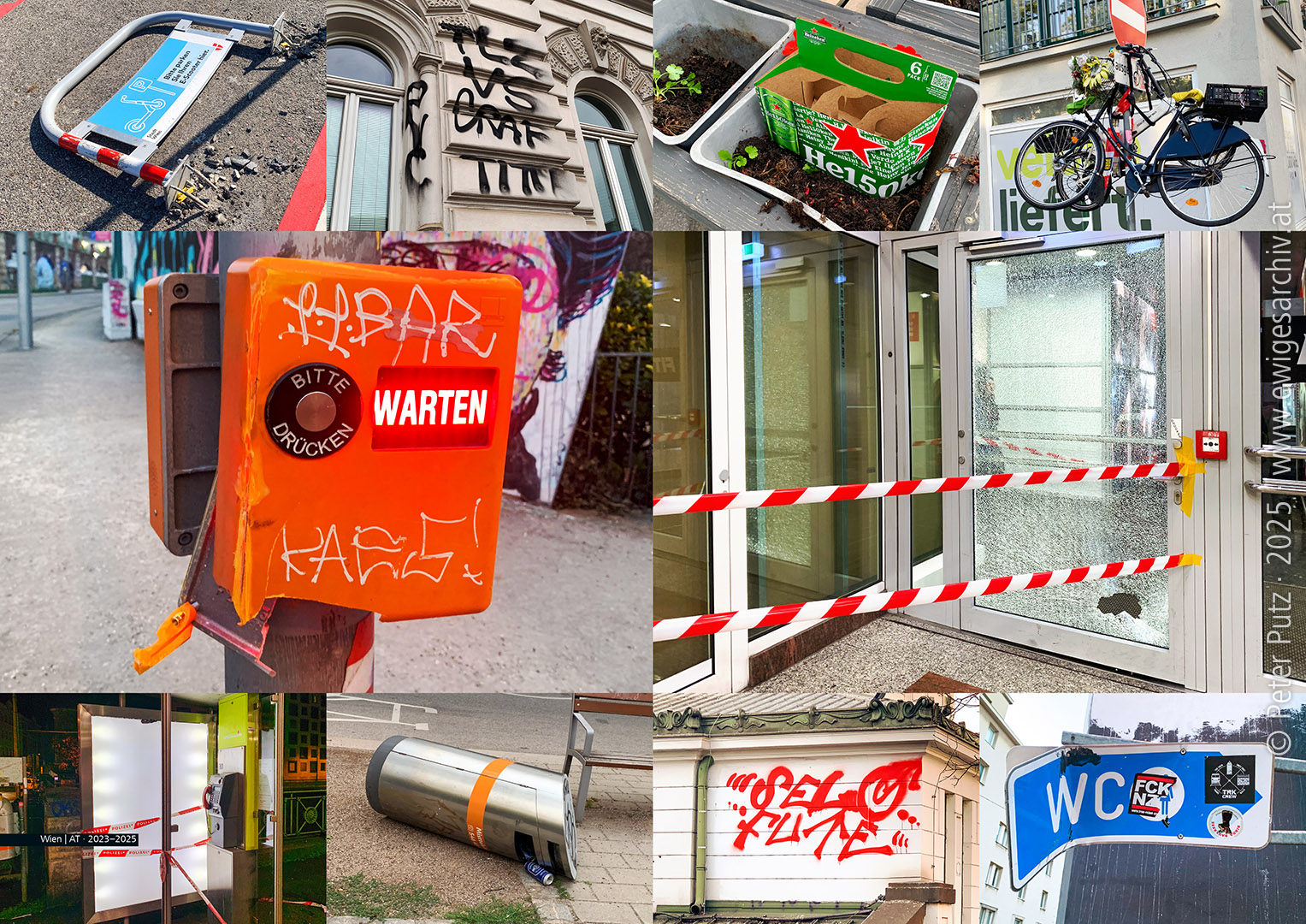Vandalismus in Wien | AT · 2023–2025  (© PP · # 3537 · www.ewigesarchiv.at) Im hauseigenen digitalen Tiefspeicher des Ewigen Archivs finden sich aktuell unter dem Begriff „Vandalismus“ 1493 Bild-Einträge. Nicht, dass es mir Freude und/oder Befriedigung macht, die täglichen kleinen und großen Verwüstungen zu dokumentieren. „Its a dirty job but somebody's gotta do it“. Es schmerzt mich, diese Alltäglichkeiten festzustellen und zu dokumentieren. Klar: es gibt Schlimmeres – aber: das gibt’s immer. Die potentiellen Beweggründe der Zerstörer*innen interessieren mich übrigens in keiner Weise, dafür kommt mein Wunsch von ganzem Herzen: Der Blitz möge sie beim Scheißen treffen! Just sayin’.