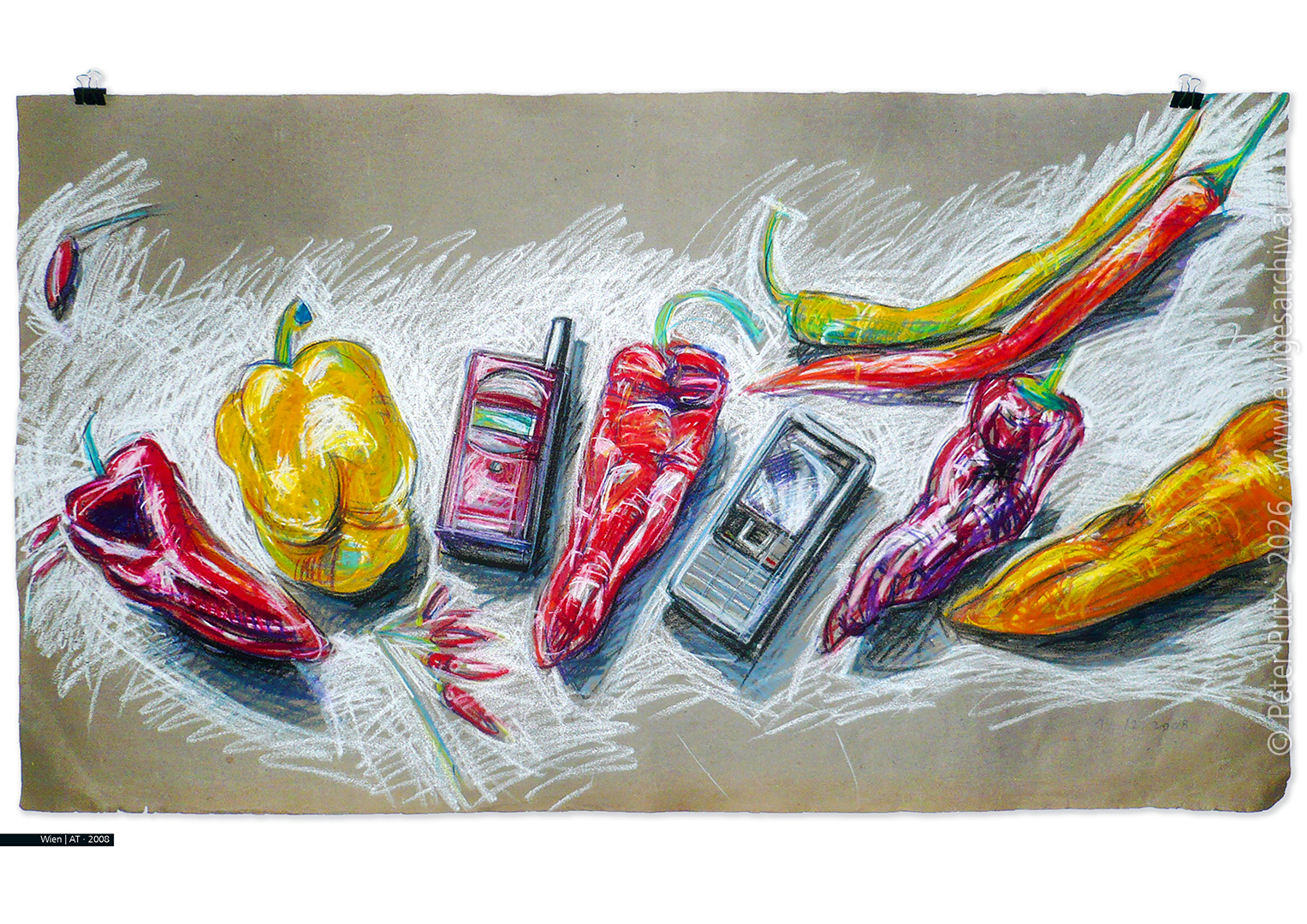 Four pointed peppers, a red Ericsson flip phone, a grey Nokia mobile phone, a yellow pepper, two hot peppers, a few chillies. A strange combination, drawn in December 2008 with oil pastel crayons on a piece of old paper. Nothing more. Vienna | AT · 2008 (© PP · # 3672 · www.ewigesarchiv.ats)... read more