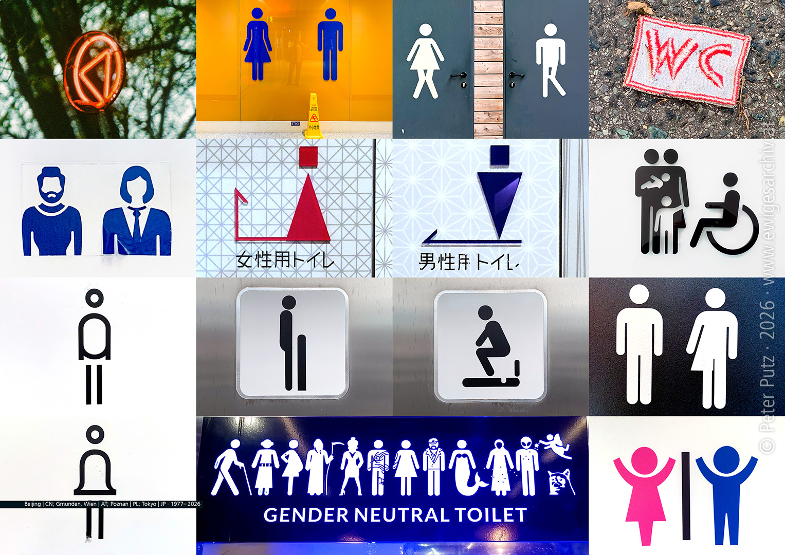 Toilet pictograms, my love! Beijing | CN; Gmunden, Vienna | AT; Poznan | PL; Tokyo | JP · 1977–2026 (© PP · # 3750 · www.ewigesarchiv.at) Sitting or standing? From the „toilet“ or „loo“ to the „Missoir,“ the „Mobile Urinal for People Perceived as Female (FLINTA*).“ A tableau from the Eternal Archive on a pressing need. Where does this come from? Perhaps from the fact that my father inherited a plumbing business from his aunt while studying political science, then (in a crash course?) passed his master craftsman’s exam, ran the business for a few years, then went to Mosul in Iraq to teach plumbing and pipe laying at an Austrian-run vocational school for construction workers? In none of the numerous compilations on the topics of „toilets,“ „toilet signage,“ „toilet pictograms,“ etc., is the photo in the upper left corner indispensable—a guiding light for decades, and I’m delighted and even proud (yes, really!) that it’s part of the Eternal Archive collection. Back in 1977, at the beginning of my studies in Poznan, Poland, I noticed the small neon symbols with a circle and triangle that marked public restrooms—I found them very elegant and minimalist—they’ve surely disappeared by now.