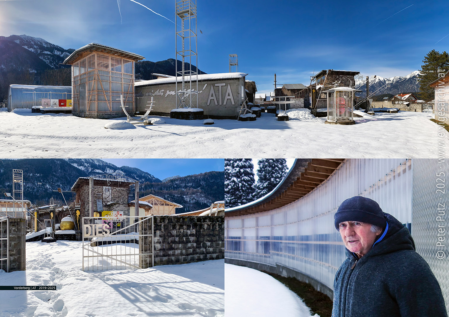 Reflecting on Cornelius Kolig (1942–2022) in summer and winter in ‘Paradise’. Vorderberg | AT · 2019–2023 (© PP · # 3563 · www.ewigesarchiv.at) On one of the last days of summer, strolling through the more than 8,300 photos and about 160 video sequences that I have taken over the past 45 years about the artist Cornelius Kolig and his ‘paradise’ in Vorderberg in the Gailtal valley in Carinthia, I thought to myself that this was exactly the right time to make another tableau about it. For many years, I visited Cornelius and his wife Doris Kolig in Vorderberg in the Gailtal valley in Carinthia in all seasons, so I also walked through Cornelius’s ‘paradise’ in winter, saw new objects and installations, and was able to follow how the complex and the works were changing and expanding. The photo on the bottom right was taken in the winter of 2019, when I accompanied him as he fed the numerous cats that lived and still live on the grounds. Cornelius Kolig passed away in November 2022, and it will no longer be possible to take these tours with him, to talk to him about his work, to hear him talk about his objects, his work, his intentions. One building at the gate is labelled ‘Reanimation’ – the large one on the left in the upper panoramic photo – which houses a kind of experimental facility for bringing the dead back to life through the sounds of the living, their favourite music, sounds, etc. He talks about this in my video ‘Cornelius Kolig leads through paradise’. So, if you want to hear something authentic about it…